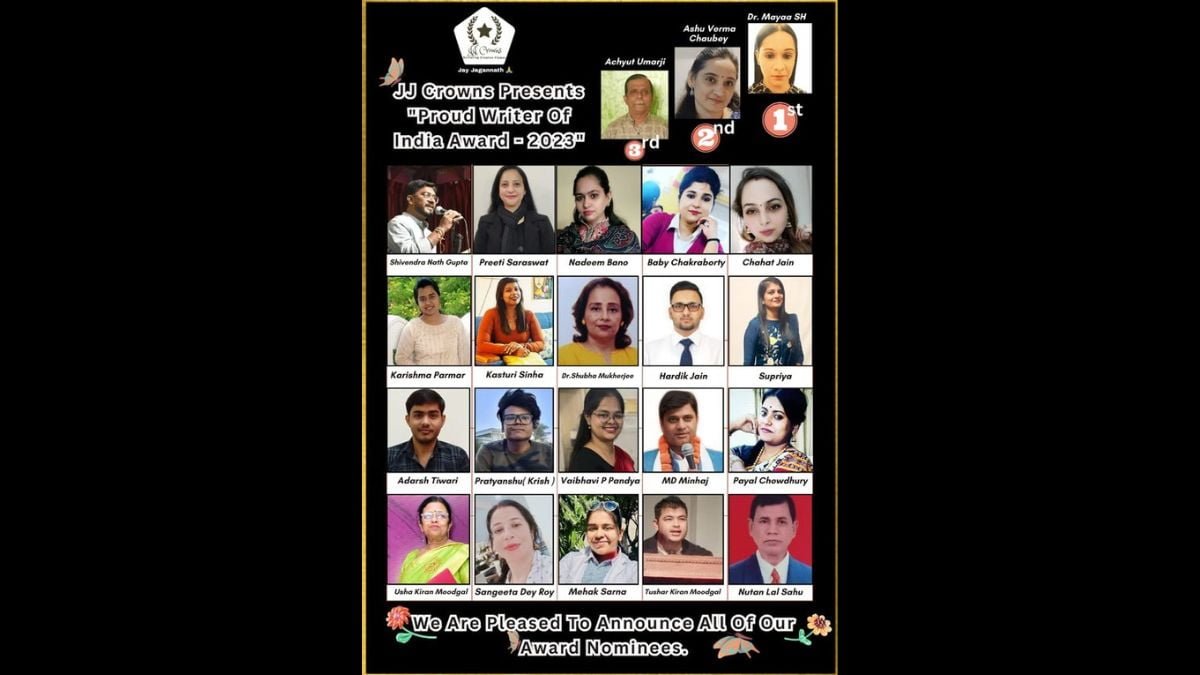 Now In this Contest, “Proud Writer Of India Award – 2023” we Selected the Best 3 Winners (Dr. Maya SH, Ashu Verma Chaubey, Achyut Umarji) along with top winners (Kasturi Sinha, Hardik Jain, MD Minhaj, Chahat Jain, Baby Chakraborty) and the result decided by our great judges Dr/Prof Mr. Prafulla Kumar Dash Sir and Mr. Sharad SP Jain Sir. And in this competition, it’s not about winning or losing. What truly matters is the effort and dedication of all the Awardees that they put into it.