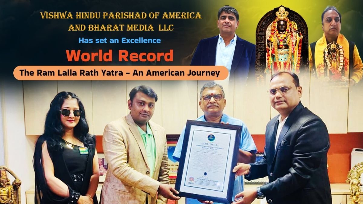The adjudication for this esteemed World Record was overseen by Adv. Dr. Manish Das of the High Court, New Delhi, adding further prestige to an already monumental occasion. Honoring this achievement, Shree Milind Parande, Organising General Secretary, Vishwa Hindu Parishad and Hon Hriday Raval, Co-Founder | COO of Bharat Media LLC, received the award from Dr. Rajib Pal, Founder | President of the World Book of Star Records, and its ambassador Smt. Santshree Bhattacharya in Ahmedabad, India, on behalf of Shree Amitabh Mittal and Shree Manan Raval.